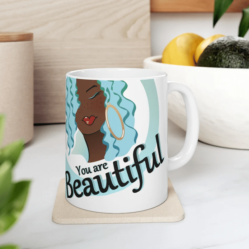 Small items to remind you that you are beautiful. 2023 Desk Calendar with self-care focused saying, cute coffee mugs, notebooks to remind you how special you are.